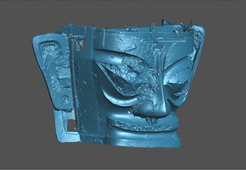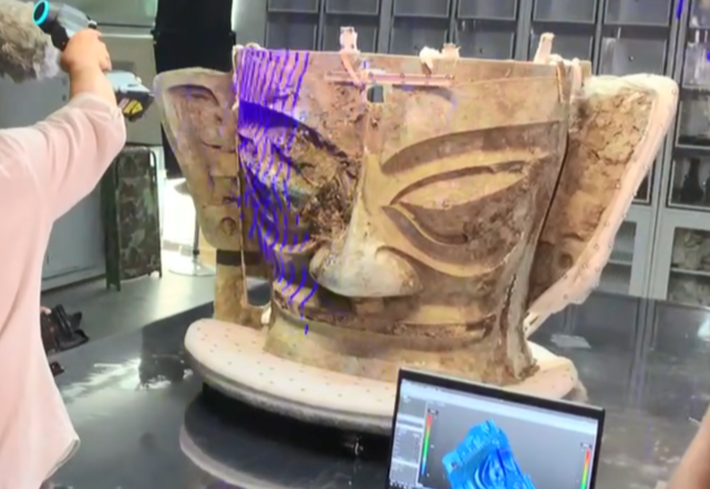 ▲使用智能手持式藍(lán)色激光掃描儀掃描寬1.38m的青銅大面具