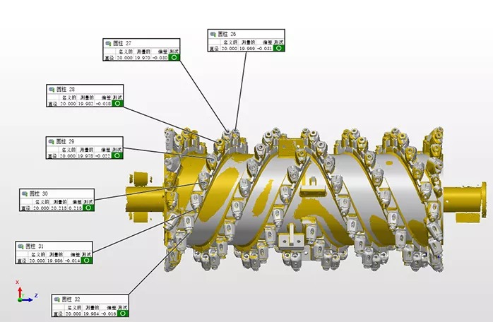銑刨鼓是道路銑刨機(jī)的核心,需經(jīng)過嚴(yán)格的檢測,以避免磨損以及變形的負(fù)荷縮短設(shè)備使用壽命。過去采用接觸式打點(diǎn)來進(jìn)行檢測,不但測量速度慢,而且測量死角多,測量數(shù)據(jù)不全,且銑刨鼓的刀頭為活動(dòng)刀頭,裝配后測量無法測得準(zhǔn)確的刀頭點(diǎn)位。