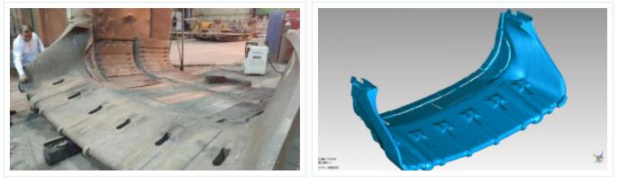 客戶使用傳統(tǒng)卡尺測(cè)量建模的方法對(duì)挖斗進(jìn)行逆向建模,經(jīng)常會(huì)遇到諸如測(cè)量速度慢、曲面測(cè)量不準(zhǔn)確、無法對(duì)復(fù)雜曲面進(jìn)行 測(cè)量等問題,建模很大程度取決于工程師的感覺,不可能做到1:1還原??蛻粝Mㄟ^三維測(cè)量,解決建模精準(zhǔn)度和建模規(guī)范化的 問題。