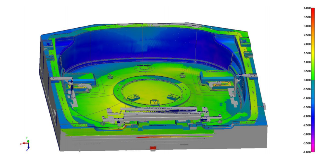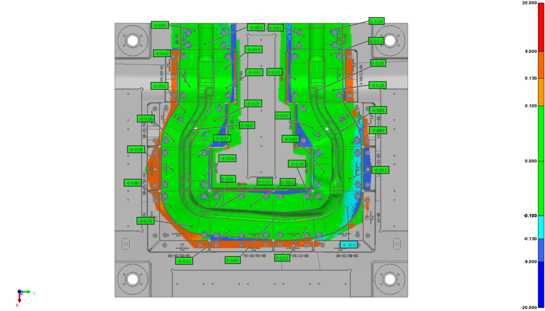 將掃描得到的三維數(shù)據(jù)與原數(shù)模進(jìn)行比對(duì)分析,獲取偏差尺寸,為質(zhì)量檢測(cè)及修模改模提供精確且直觀的數(shù)據(jù)報(bào)告,大大提升模具生產(chǎn)效率和產(chǎn)品質(zhì)量。