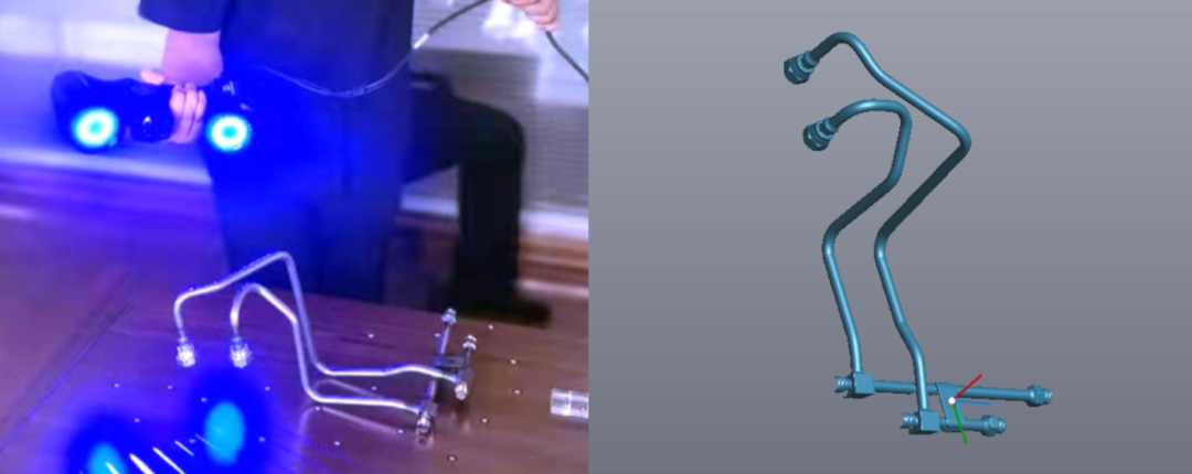 使用RigelScan智能手持式激光3D掃描儀代替彎管檢具,對(duì)管徑10mm的叉車油管進(jìn)行測(cè)量,直接快速獲取準(zhǔn)確的彎管數(shù)據(jù);同時(shí)利用掃描軟件RigelScan里的管件模塊可實(shí)現(xiàn)高效自動(dòng)檢測(cè),并支持與彎管機(jī)無(wú)縫對(duì)接。